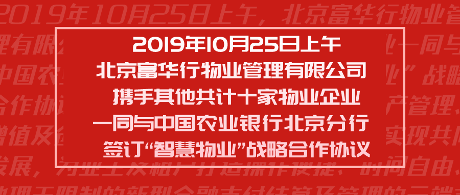 富华行一贯秉承“以科技触手可及服务,以人的服务传递温度”的经营发展理念。此次与农行的合作将充分发挥各自优势,有利于资源共享,突出各自主业、做精各自专业、各方协调发展,实现银行、物企、业主、和专业供应商四方参与、互利共赢,完美打造智慧楼宇与智慧社区。