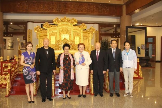 6月26日,尼扎米国际中心联合主席、拉脱维亚前总统瓦伊拉.维凯-弗赖贝加(Vaira VīKe-Freiberga)及丈夫伊曼茨.弗赖贝格斯(Imants Freibergs),在中国人民外交学会会长吴海龙陪同下参观中国紫檀博物馆。中国紫檀博物馆馆长陈丽华、副馆长迟重瑞在博物馆入口处热情迎接来自远方的贵宾,珠海富华紫檀博物馆副馆长赵紫薇向弗赖贝加前总统献上鲜花。
